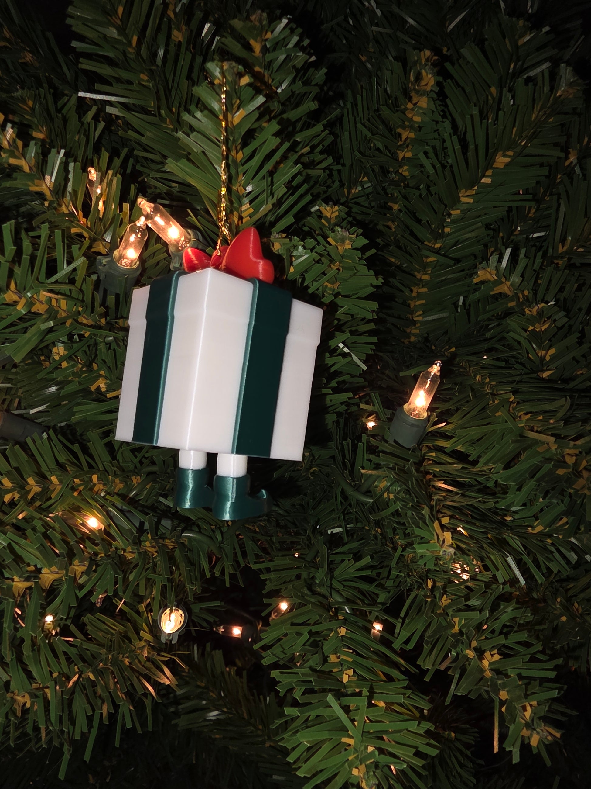Jingle in a Box is a playful holiday ornament featuring a cheerful gift box complete with festive ribbon and tiny dangling legs, as if the present itself is ready to join the celebration.